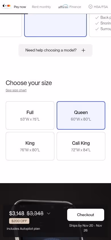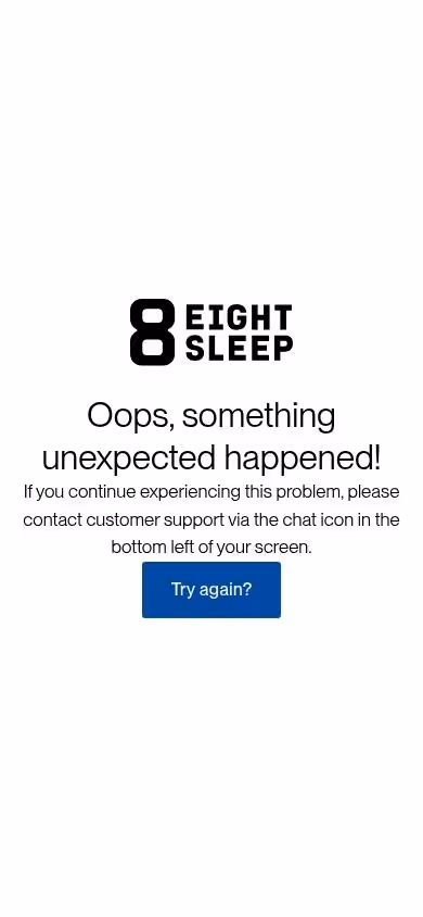 Clicking the Checkout button on the product page (Pod 5 Core Queen mattress, $3,148) results in an error page displaying "Oops, something unexpected happened!" instead of navigating to the checkout flow. Expected behavior: Should proceed to checkout page with shipping/billing information form. Actual behavior: Error page appears, blocking the purchase flow entirely.